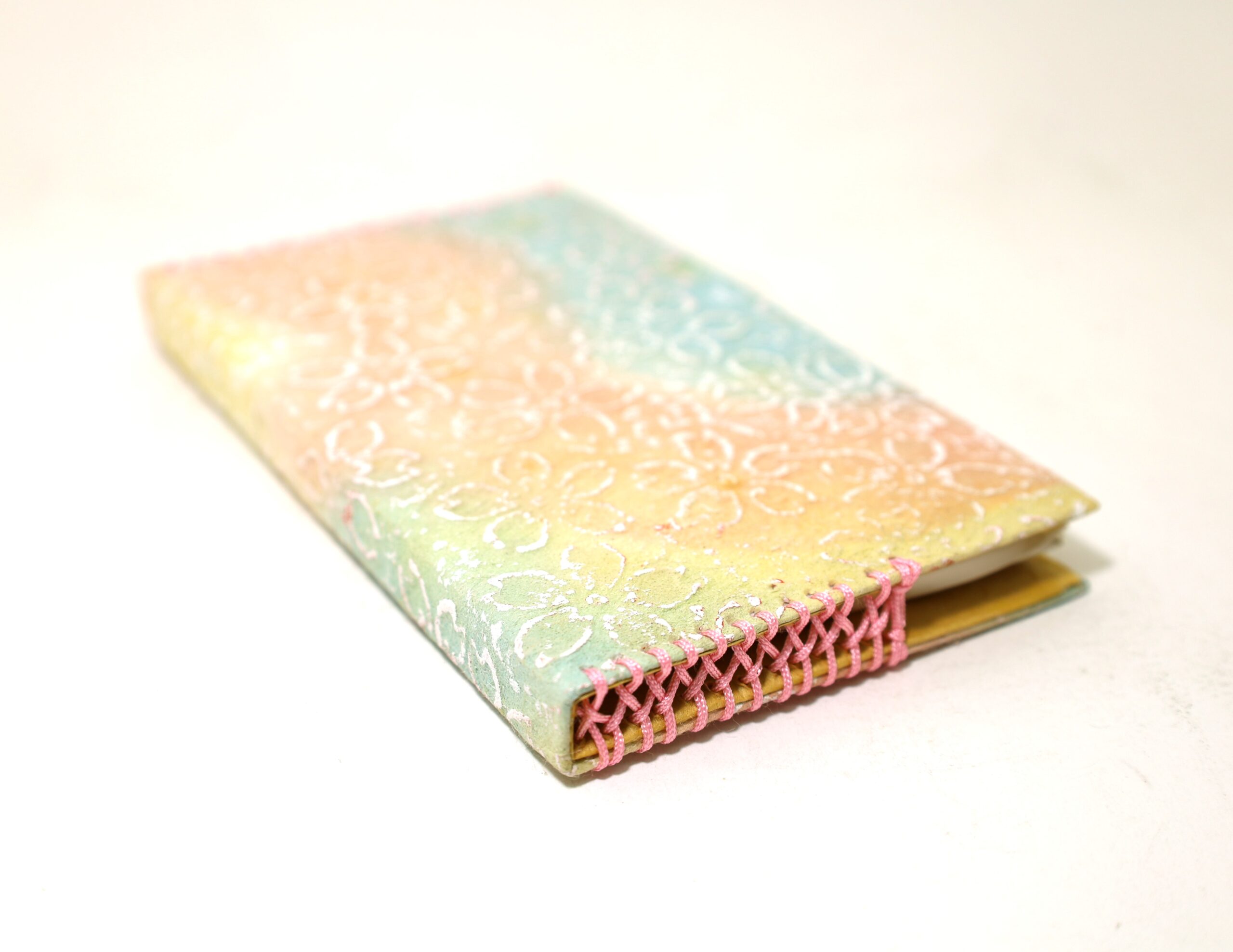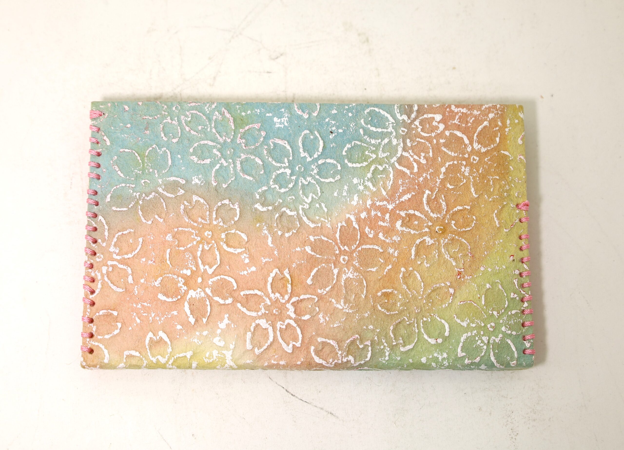 手で漉いた紙は、模様を彫った木型に乗せて叩くことでエンボス加工のような凹凸を付け、版画のように凸部分に色を付けてあります。これは、凹凸の型を付けても破れないほど丈夫な素材を使っているという事を証明するためでもあります。