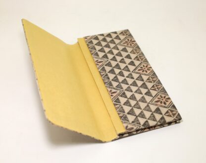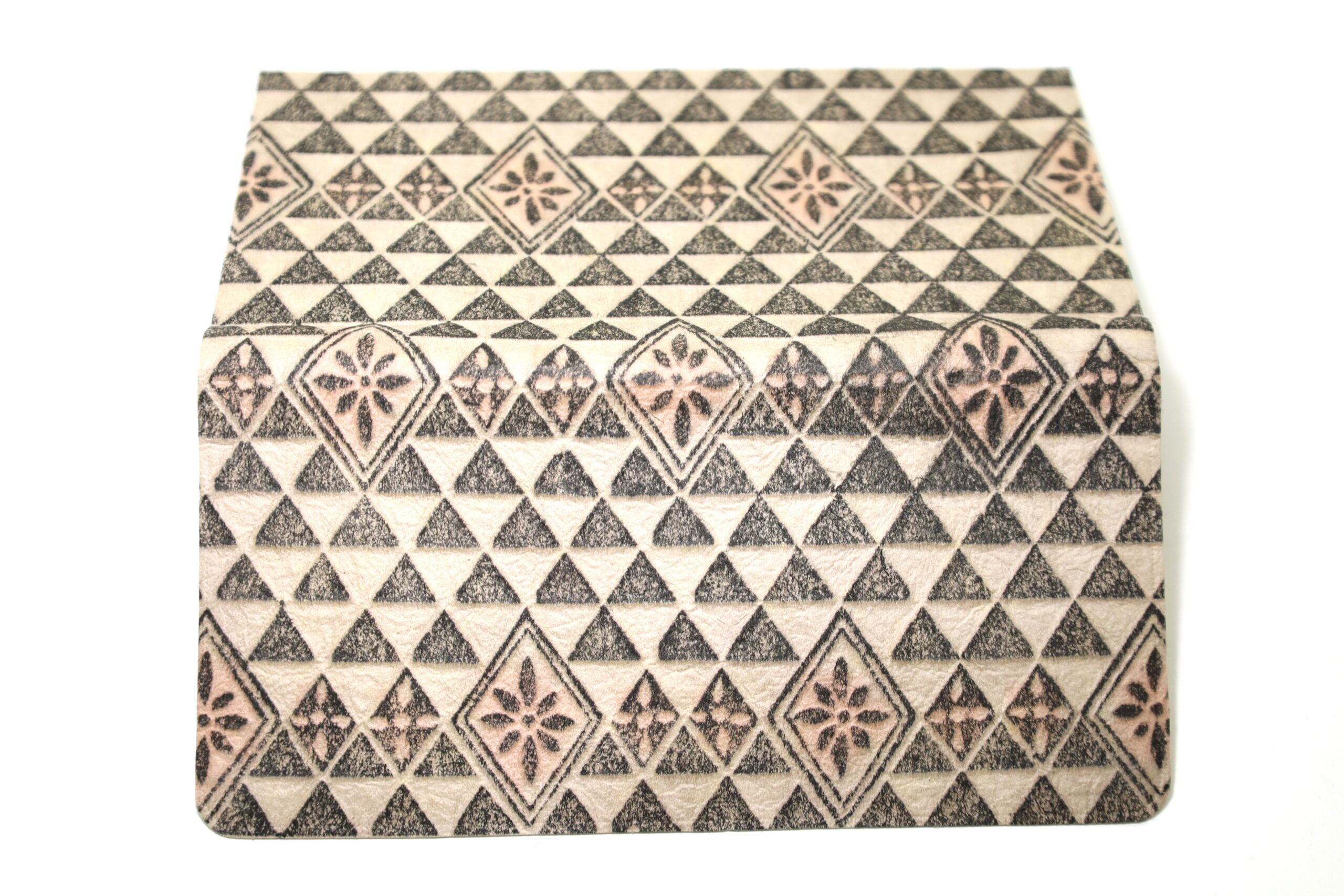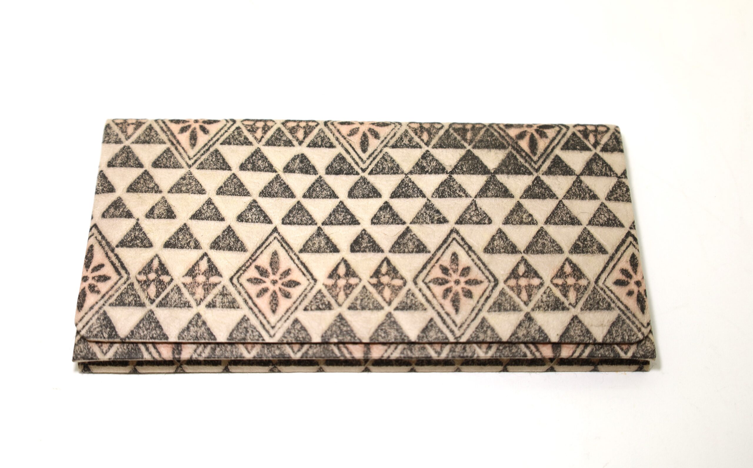 手で漉いた紙は、模様を彫った木型に乗せて叩くことでエンボス加工のような凹凸を付け、版画のように凸部分に色を付けてあります。これは、凹凸の型を付けても破れないほど丈夫な素材を使っているという事を証明するためでもあります。